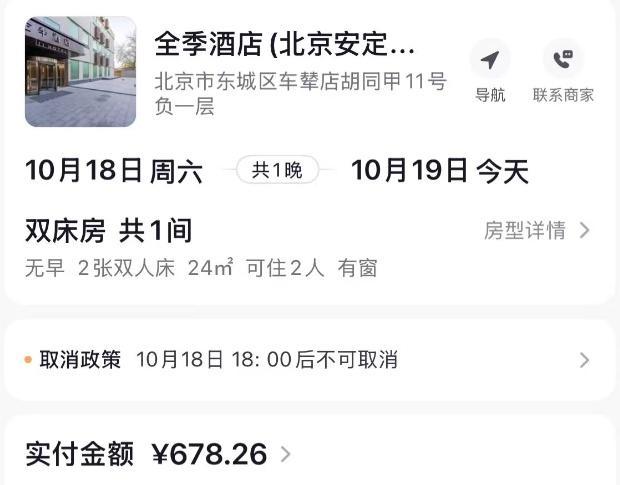 该消费者张小姐告诉南都湾财社记者,她和朋友近日在北京旅游,在社交平台订了全季酒店(北京南锣鼓巷安定门地铁站店)10月18日至10月19日一晚的住宿,房费约678元。